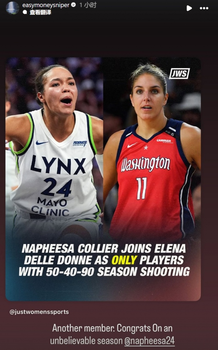 球队核心娜菲莎-科利尔本赛季场均登场33.3分钟,贡献23.6分7.5篮板3.3助攻1.7抢断1.6盖帽的全面数据,其投篮命中率高达53%,三分命中率40.3%,罚球命中率90.6%,正式达成"180俱乐部"里程碑!
